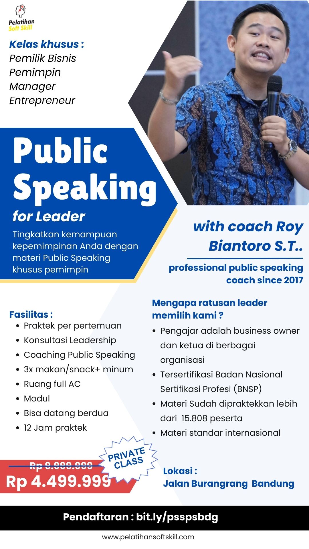 Pelatihan Public Speaking Khusus untuk para PEMIMPIN, PEMILIK BISNIS dan MANAGER. Kuasai komunikasi ala kepemimpinan yang berkarisma, tegas dan berwibawa sehingga